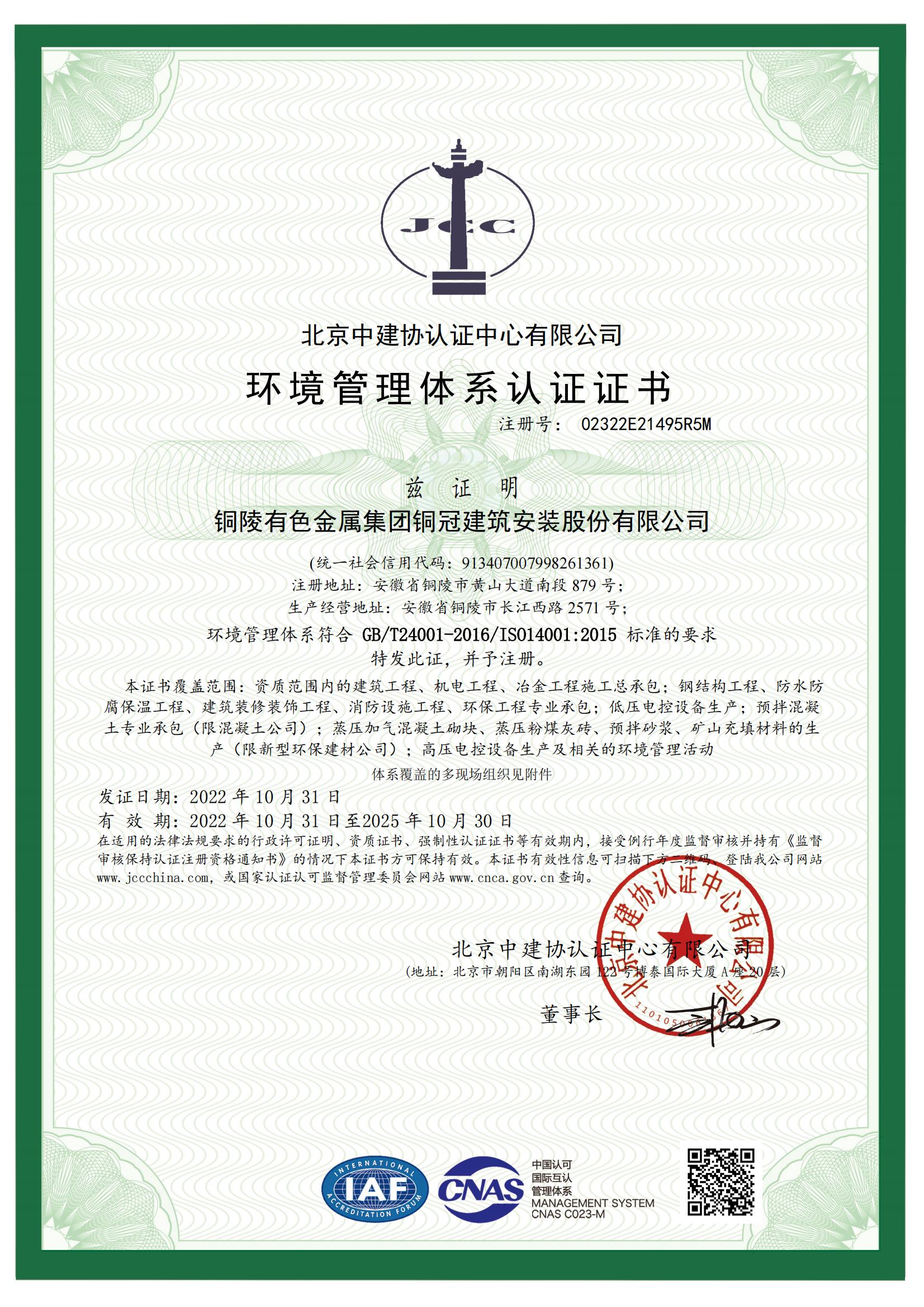 环境管理体系认证证书